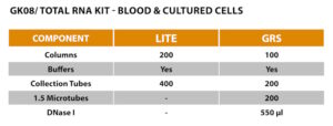 The LITE Total RNA Kit – Blood & Cultured Cells uses the same principle as GRS Total RNA Kit – Blood & Cultured Cells (#GK08.0100), providing only the essential components for the main application of the kit, which can be found below.