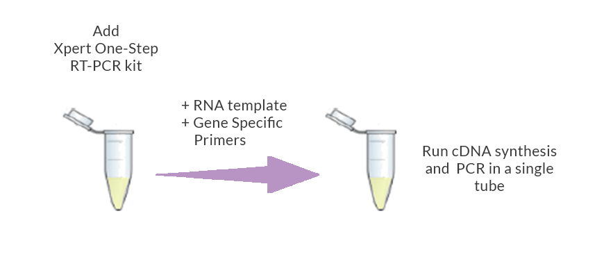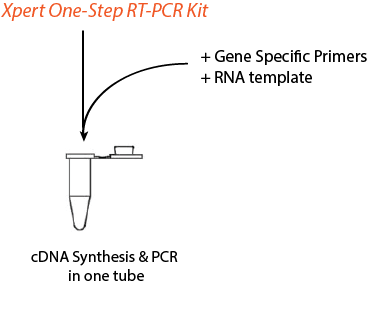 Using gene-specific primers (GSP), the Xpert One-Step RT-PCR Kit allows for first-strand cDNA synthesis and subsequent PCR in a single-tube reaction procedure, decreasing contamination risk and reducing hands-on time considerably.